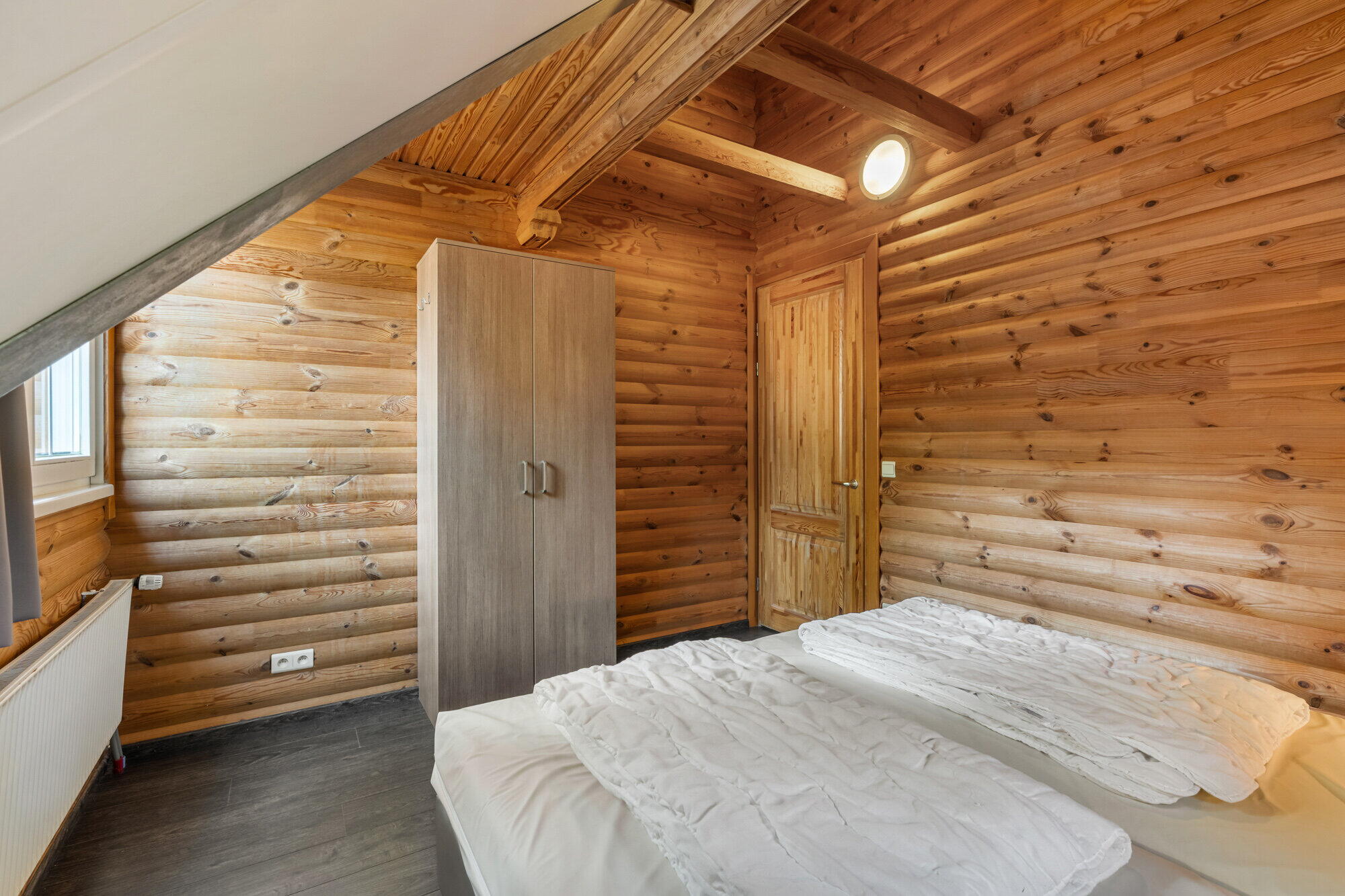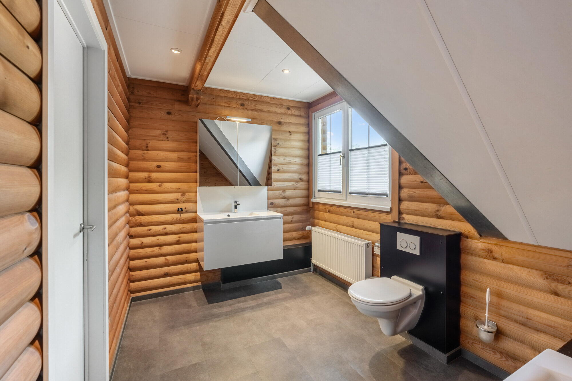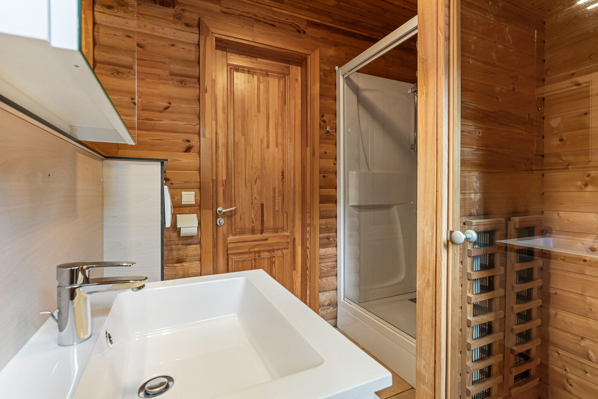 - Badkamer met toilet, douchecabine, sauna (1 persoon), enkele wastafel met spiegelkast, radiator;