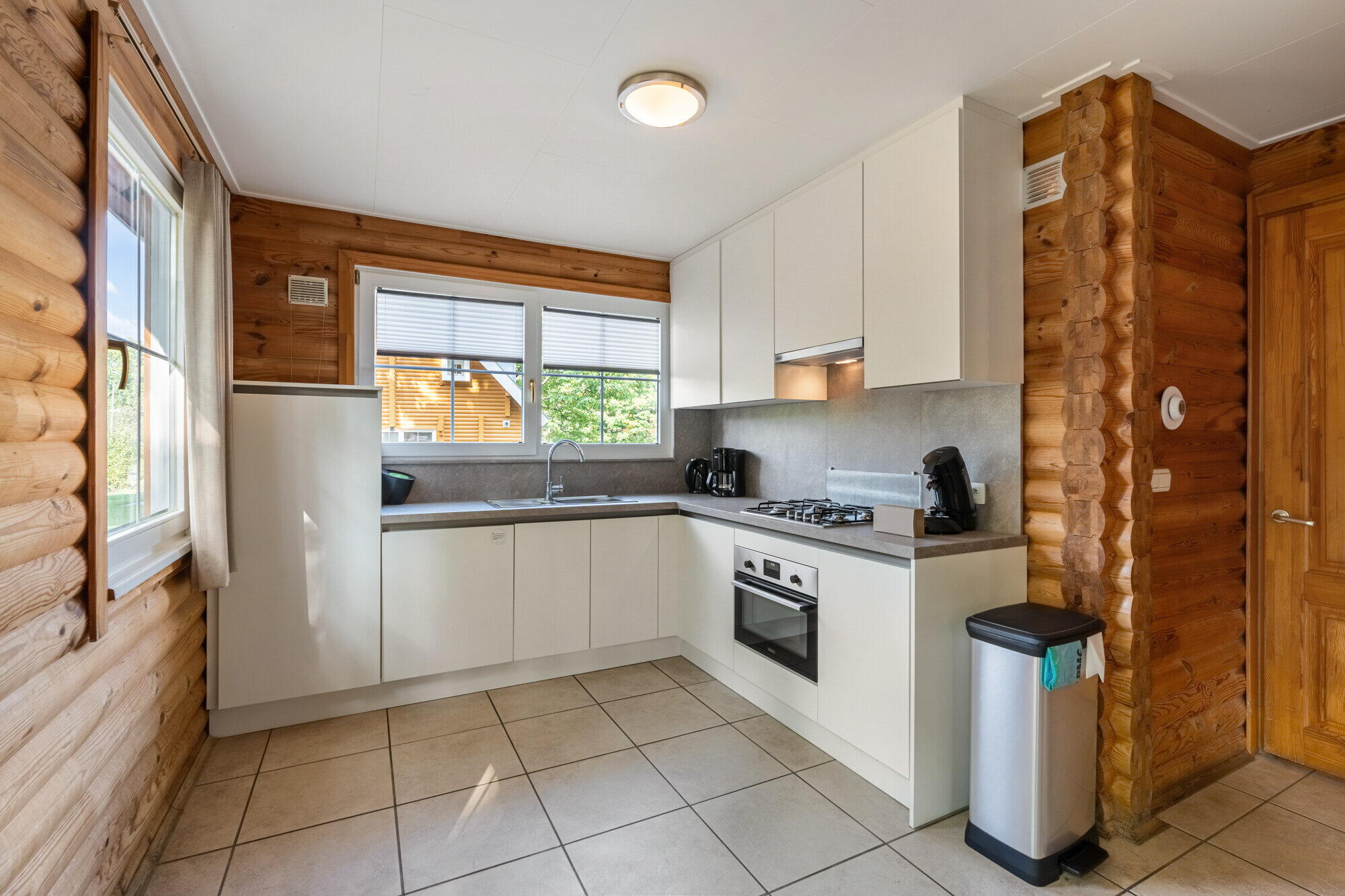 - Keuken met koelkast, wasbak (Franke), vaatwasser, 4-pit gasfornuis (Zanussi) met afzuigkap, oven (Zanussi);